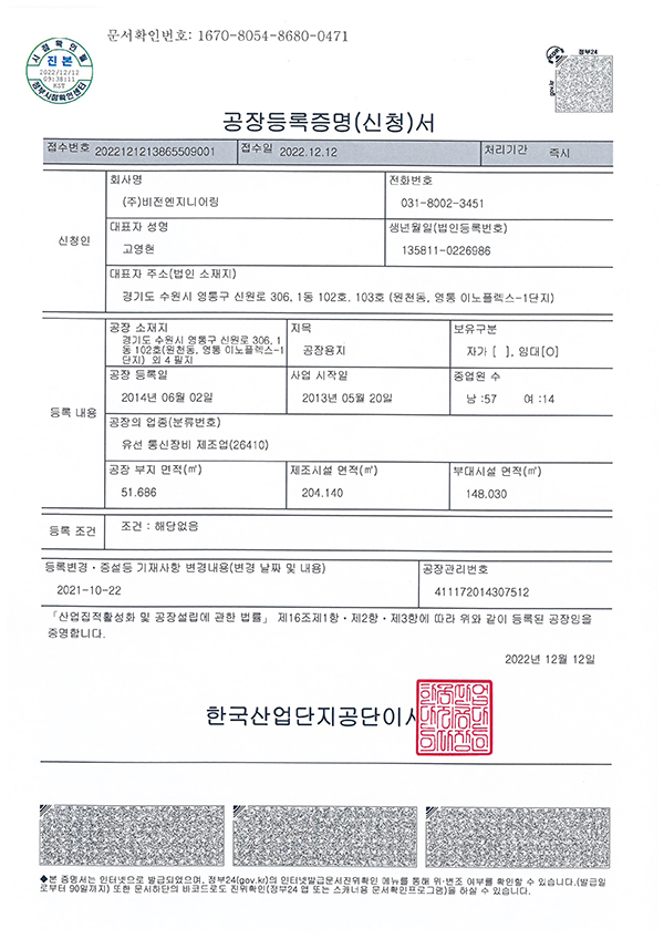 26410 수원(유선 통신장비 제조업) 공장등록증