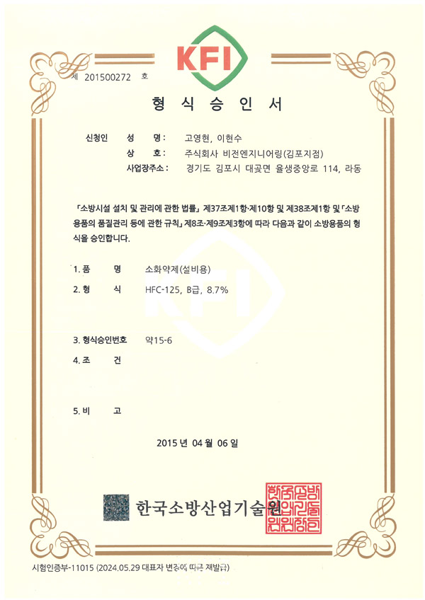 형식승인서 HFC-125 소화약제 > 인증서 및 특허