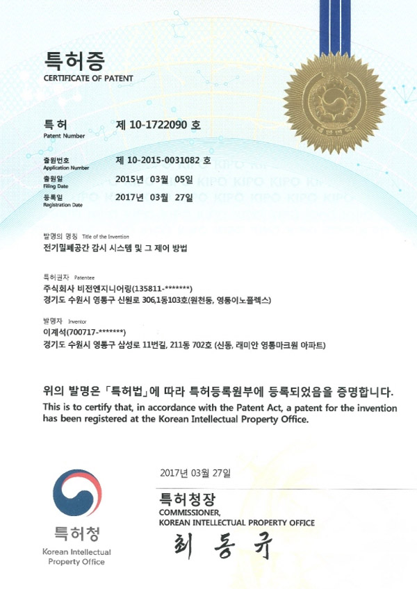 특허증 전기밀폐공간 감시 시스템 및 그제어 방법 > 인증서 및 특허