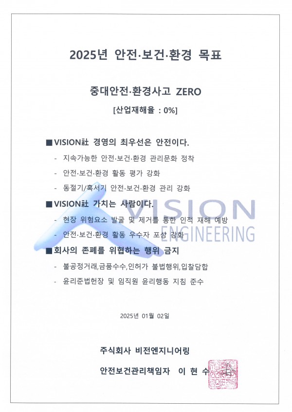 비전엔지니어링은 안전보건경영이 지속가능경영활동의 필수적인 핵심 경영요소임을 인식하고