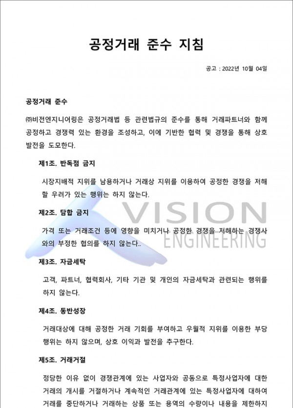 비전엔지니어링은 윤리경영과 준법경영을 바탕으로 고객에게 신뢰받는 청렴 일류기업으로 도약하기 위해