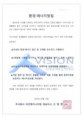 비전엔지니어링은 ISO14001을 기반으로 친환경 사업운영을 위해 노력하고 있습니다.